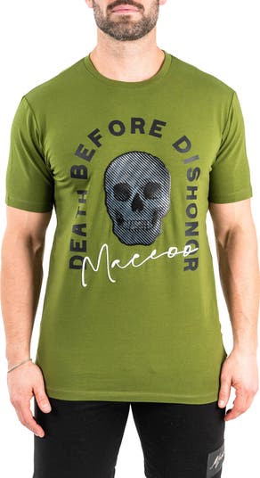 Words of courage frame the textured skull on a stretch-enhanced cotton T-shirt finished with side vents ideal for an untucked look.