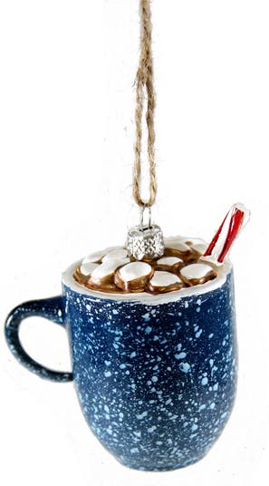 This glass ornament shaped like a mug of hot cocoa adds a delectable element to any tree.