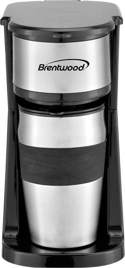 The powerful 700-Watt Brentwood Portable Single Serve Coffee Maker with 14-Oz. Travel Mug is everything you need to start drinking coffee instantly. Just choose your soft pods or grounds, add water, and push to brew up to 14 oz. of single-serve coffee. Save money using the reusable mesh filter cup. Easily fill unit with water with its top-loading lid. The removable filter cup and filter holder make for easy cleaning. The coffee maker, parts, and travel mug are completely BPA-free.