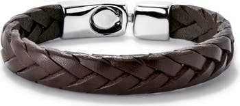 Cognac color braided leather sterling silver-plated bracelet with clasp.