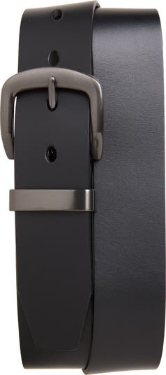 A burnished leather construction defines this belt fitted with a polished buckle for a bit of shine.