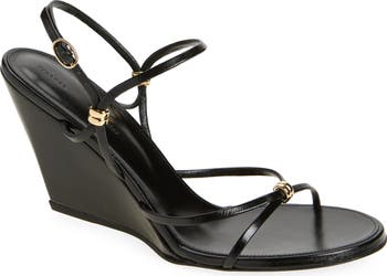 Gilt coil hardware punctuates the strappy profile of this glossy leather sandal elevated on a sculptural wedge heel.