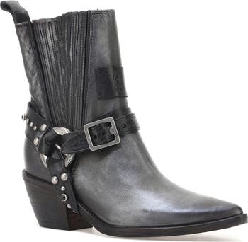 Ornately engraved harness hardware and antique-finish studs amp up the bold biker styling of this burnished-leather boot tanned and treated by hand.