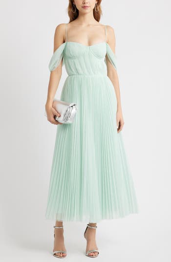 Evoke Old Hollywood in a frothy chiffon cocktail dress offered in a minty hue and designed to show off your shoulders.