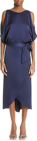 The essence of simple elegance, this satin shift dress boasts breezy cold-shoulder sleeves, a tie-cinched open back and tulip skirt.
