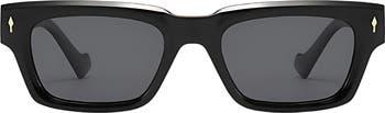 Slim rectangular frames and logo-stamped temples distinguish polycarbonate sunglasses fitted with polarized lenses for glare reduction and superior clarity.