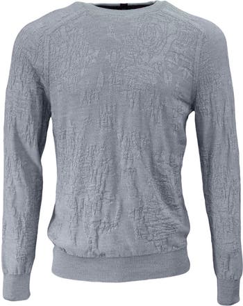 Step up your sweater game with this luxurious paisley crew neck. Crafted from a blend of superfine merino, silk, and cashmere, it boasts a saddle shoulder, ribbed details, and a signature polkadot stripe at the collar's back. Elevate your wardrobe with this elegant, textured piece