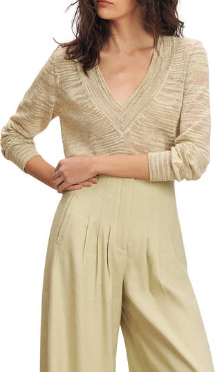 Shimmering metallic threads elevate this figure-skimming sweater topped with a dipped neckline.