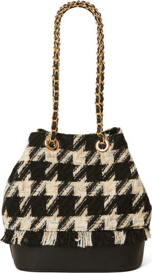 Mixed textures and a polished herringbone pattern lend visual intrigue to a spacious bucket bag fitted with convertible straps for versatile styling.