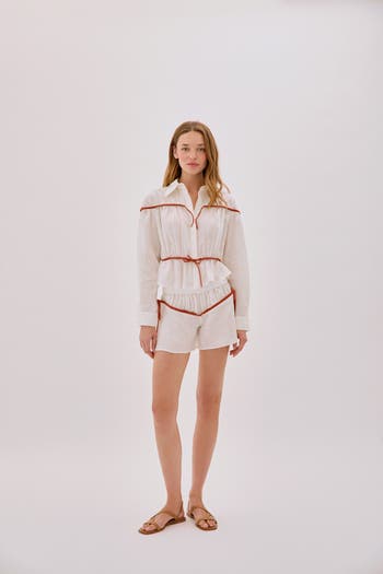 The Colette Ecru Linen Shirt is a summer showstopper; perfect for the Labeca woman’s wardrobe. This collared shirt features two lines of contrast terracotta piping, adding a subtle pop of colour and a touch of elegance. The tie detail at the waist adds a unique twist, making it stand out from the usual button-up styles. With long sleeves and a classic button-up design, it offers a timeless, versatile look. Designed as part of a matching set, this shirt pairs effortlessly with its coordinating Colette Ecru Shorts for a chic and coordinated ensemble.