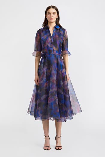 Printed organza shirtdress featuring a soft blend of abstract blues and purples with a sheer flounce sleeve. Finished with a tie belt and floral accent at the waist—a polished yet playful look for winter occasions.