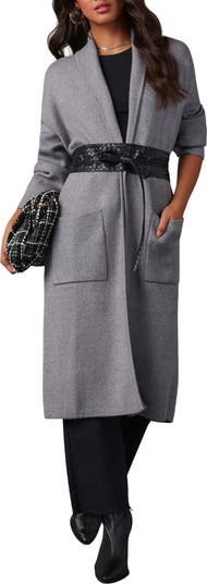An open front underscores the relaxed yet polished look of a longline duster that can be neatly cinched with an optional belt.
