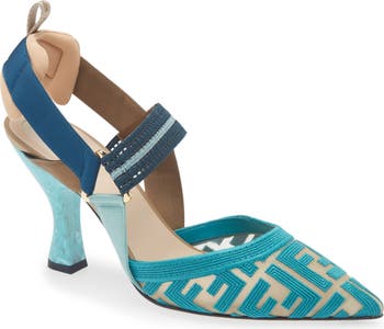A logo-embroidered mesh vamp and sporty stretch straps make an unexpected pairing for a signature pump set on a beautifully sculpted heel. A cushioned heel pad with a pull loop adds another utility-chic element.