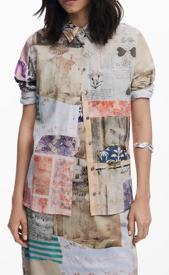 An artful collage print invites exploration in this button-up shirt made from crisp cotton poplin.