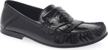 This soft deconstructed loafer crafted in Spain from glossy kidskin leather features a gathered moc toe and kiltie fringe with an embossed Marni logo. It's designed with a collapsible back heel so that it can also be worn as a mule.