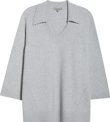 Pearly beads unexpectedly embellish the collar of this soft sweater framed by three-quarter sleeves and anchored by ribbed trim.