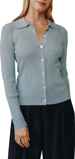 Sweater-knit fabric lends a cozy feel to this ribbed button-up top made with a classic collar and a fitted silhouette.