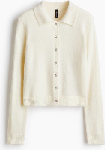 Short cardigan in a soft, fine knit with a collar, buttons down the front and long sleeves. Ribbing at the cuffs and hem.