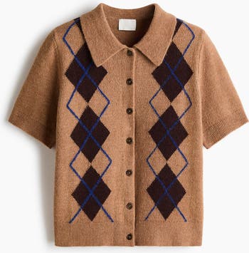 Cardigan in a soft knit with a collar, buttons down the front and short sleeves. Ribbing at the cuffs and hem.