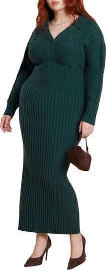Slip into sleek knit dressing with this collared sweater maxi dress that defines the waist and elongates the silhouette. A body-skimming fit and contrasting textures bring modern polish.