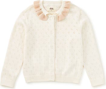 This Collared Pointelle Cardigan adds a soft, timeless layer to everyday outfits and special moments alike. Crafted from 100% combed cotton, the delicate pointelle knit feels breathable and comfortable while still offering just the right amount of warmth. A classic button-front design and low-hip length make it easy to layer over dresses or tees, while the decorative collar-finished with subtle shiny thread-adds a hint of sparkle that feels extra special without being overdone. Thoughtful details like a spare button and a hand-me-down label reflect its made-to-last quality, perfect for passing along to siblings or friends once outgrown. A sweet, versatile cardigan designed for wear now and memories later.