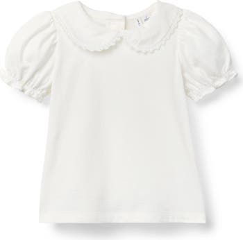 Our goes-with-everything top is finished with lace trim at the collar for a special touch. Plus, puff sleeves and ruffle cuffs too.