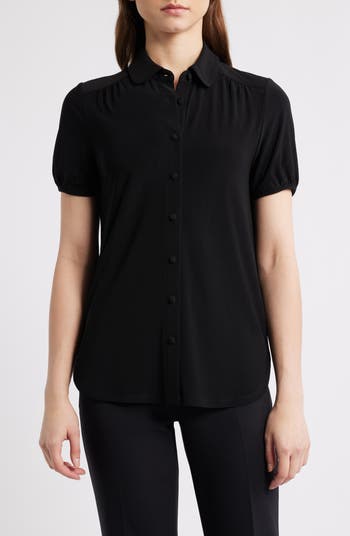 A Peter Pan collar sweetens the style store of this polished crepe button-up framed by lightly puffed short sleeves.