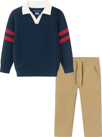 A contrast collar tops the cozy sweater that keeps baby feeling cozy in this set with coordinating pants.