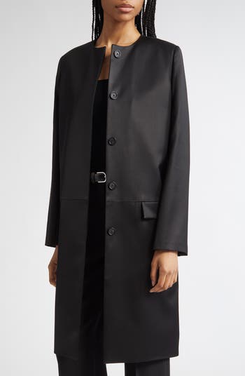 The Scandinavian label synonymous with minimalism and timelessness leans into its roots with this collarless coat tailored from structured stretch chintz with a slight sheen.