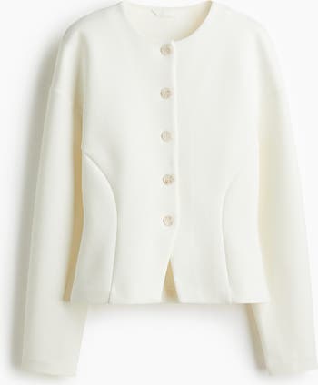 Single-breasted blazer in scuba knit fabric with a round neckline, buttons down to the waist and a flared cut from the waist to the hem. Dropped shoulders and long sleeves.