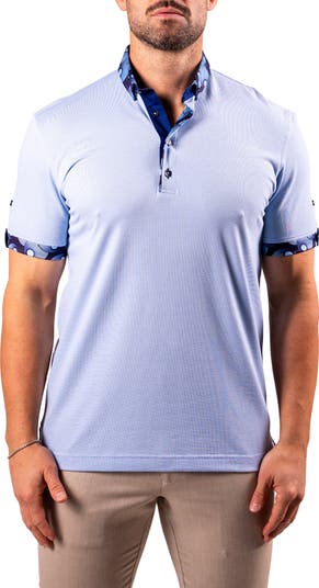 A baby-blue piqué knit crafted with breathable cotton and brushed for softness makes a comfortable favorite of a polo designed with a stretchy, physique-hugging fit. Contrast panels pop at the button-down collar and roll-tab sleeves for a look that lets you go sporty or casual depending on your mood or the occasion.