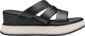 A layered platform and cork-wrapped wedge heel bring a sporty aesthetic to a leather slide sandal featuring a strappy profile and foam-cushioned footbed.