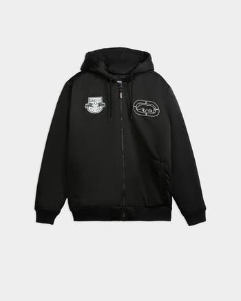 This varsity bomber features multiple chest logos and back writing for layered branding. Side welt pockets and ribbed trims ensure functional structure. Fixed hood adds coverage while keeping the fit streamlined.