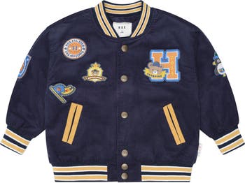 Meet your new favourite layering piece. This college style cord jacket in navy blue features varsity patches on the front, back and sleeves, deep pockets, and antique brace snaps. The perfect in between weather cover up.