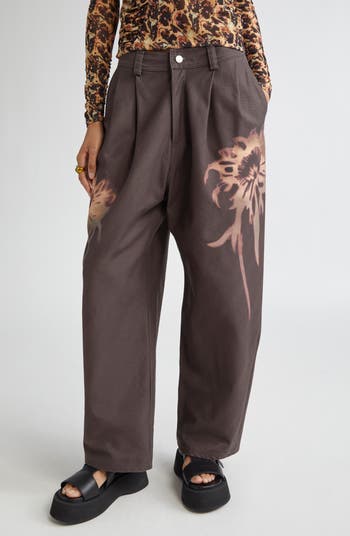 Known for reinventing classics, Hillary Taymour sets her sights on traditional wide-leg jeans, updating them with a pleated waist and hand-bleached flowers.