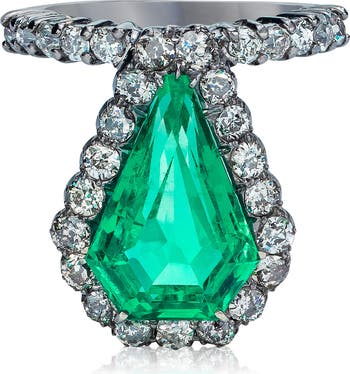 This statement-making ring features a shield-cut Colombian emerald guarded by prong-set diamonds.