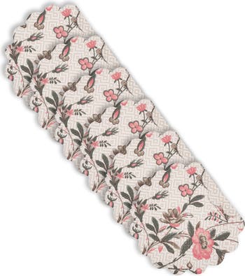 - The coral floral botanical print, geometric lattice background, and scalloped edge give these placemats a refined, colonial-garden elegance that pairs beautifully with spring, summer, and everyday dining decors in traditional and transitional settings.
