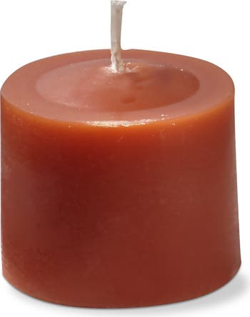 - Set of 12 Burnt Sienna votive candles made from high quality paraffin wax each measuring 1.25 inches in height and 1.5 inches in diameter with a burn time of 5 hours.