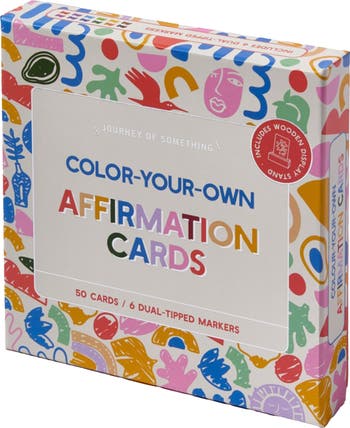 JOURNEY OF SOMETHING - COLOR YOUR OWN AFFIRMATION CARDS - Turn affirmations into a creative habit with this Paint Your Own Affirmation Cards Kit! Featuring 50 beautifully designed cards with uplifting messages, this kit lets you color, personalize, and display affirmations that inspire and motivate you daily. Just take five minutes a day to color a card and repeat its powerful message—display it on the wooden stand as a visual reminder of positivity, growth, and self-care. Studies show that affirmations can rewire your mindset, boost confidence, and enhance overall well-being—and now, you can make them uniquely yours. WHAT’S INCLUDED: 50 Color-Your-Own Affirmation Cards - Designed for mindfulness & self-reflection. 6 Dual-Tipped Markers - Bold and fine tips for creative expression. 1 Wooden Display Stand - Show off your daily affirmations in style. WHY YOU’LL LOVE IT: Encourages Mindfulness and Positive Thinking - A creative way to inspire yourself. Customizable & Interactive - Personalize each card with your unique artistic touch. Perfect for Daily Reflection - A simple yet powerful self-care routine. Great for Gifting & Self-Discovery - Ideal for those on a journey of growth.
