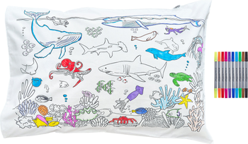 Dive deep under the sea with our fun cotton coloring pillowcase packed with marvellous marine life and fin-tastic ocean facts for kids. Add a splash of color to under the sea animal design featuring whales, turtles, dolphins, jellyfish, coral, and so much more - plus kids can learn friendly ocean facts with the layers of the ocean on the other side!