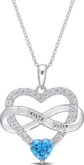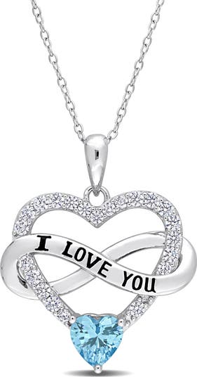This stunning infinity heart pendant adorned with cubic zirconia, symbolizes endless love and grace. Set in sterling silver, the intricate design beautifully combines the sparkle of colored and white cubic zirconia stones and the words I LOVE YOU along the infinity design. With an 18-inch chain, this piece adds sophistication to any ensemble. A thoughtful gift for someone special or a personal treasure to cherish.