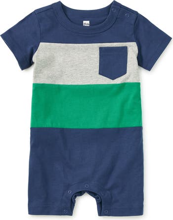 A sporty one-piece made for everyday comfort. Crafted from soft 100% cotton jersey, this romper features a classic crew neckline, short sleeves, and a cheerful colorblock design with a chest patch pocket for added detail.Snaps at the shoulder make dressing easy, while snaps at the inseam simplify diaper changes. Breathable, durable, and ready to be worn, washed, and passed along.