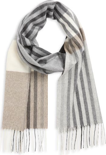 A luxe cashmere scarf in a neutral colorblock pattern adds the perfect polished finish to your cold-weather look.