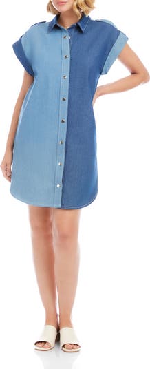 Bold colorblocking brings easy yet eye-catching style to this shirtdress popped with handy pockets and rolled short sleeves with epaulets at the shoulders.