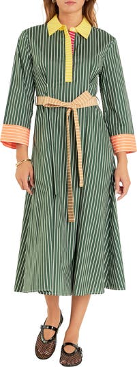 A carnival of colors comes to play across a striped shirtdress cut from cool cotton and shaped with a simple sash.