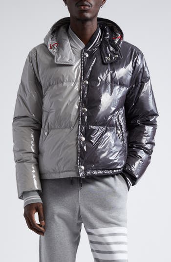 The varsity styling of a bomber meets the down-insulated warmth of a puffer in this glossy faux-leather jacket that's ready to take on drizzly days with its removable hood.