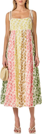 Retro blooms in a colorblocked design romance this charming midi dress designed with adjustable ties at the shoulders and handy pockets at the waist.