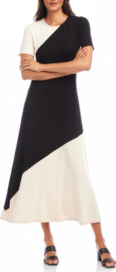 Stark angular colorblocking in classic black and white emboldens this jersey A-line midi that's ideal from day to night.