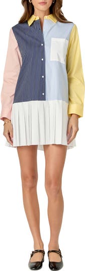 Impeccable pleats play up the retro style of a long-sleeve shirtdress patterned in bold blocks of color.