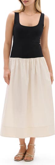 A sleeveless stretch-cotton jersey bodice with a square neckline tops this colorblocked mixed-media sundress. The crisp poplin midi skirt is softly shirred for airy volume and breezy movement.